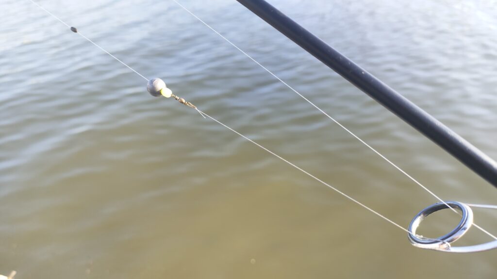 今回はちょい投げでハゼを釣ります。ロッドは76ULのメバリングロッド、リールは2000番、ラインは6lb.のナイロン、中通しのおもり1号にハリス付きの新ハゼ5号のハリを使用しました。