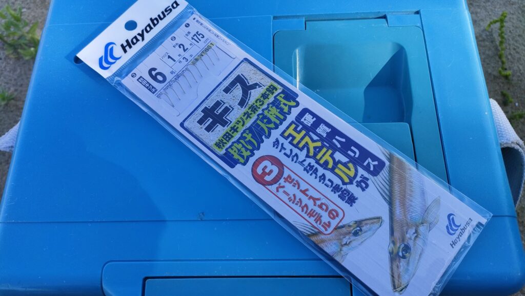 タックルはロッド、ディアルーナS106ML、3000番のリール、ラインはPE1.0号、リーダーは16lbです。仕掛けは市販のキス釣り仕掛け、エサは石ゴカイを使いました。