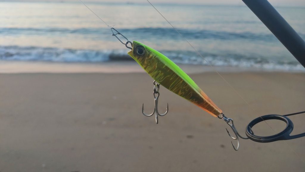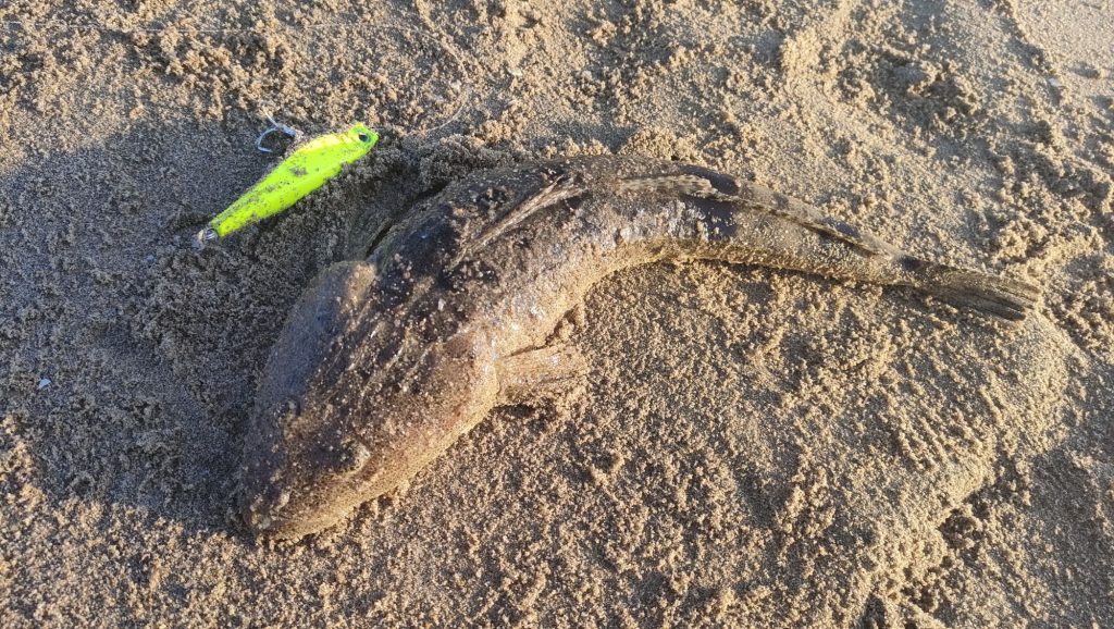 サーフはいつも通り賑わっていましたが、空いている場所を見つけてマゴチを狙います。着底させ5回ほど巻き、止めて着底させ・・・の繰り返し。良さげなブレイクもあり期待しましたが、なかなかアタリがなく時間だけが過ぎていきました。このままではノーバイトで終わるかもと思い、実績があり信頼しているカラーのマットチャートに変更。すると、しばらくして・・・ヒット!